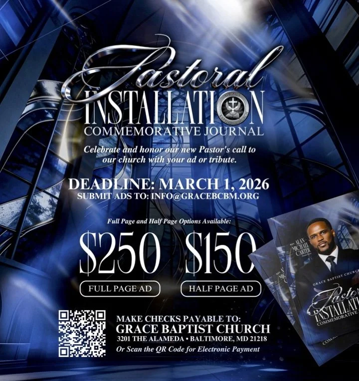 We thank you for standing with us in Christian unity and for your ongoing partnership in advancing the work of the Lord. You can submit a congratulatory advertisement by clicking the link below or mailing your payment to Grace Baptist Church 3201 The Alameda Baltimore, MD 21218. Advertisements can be sent to info@gracebcbm.org.